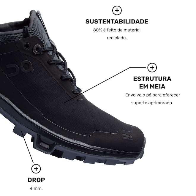 Seu cabedal (parte superior do calçado) em sintético e têxtil conta com até 80% do seu material sendo sustentável, a entressola em Cloud são de EVA e espuma Zero-Gravity e o solado emborrachado permite maior aderência.