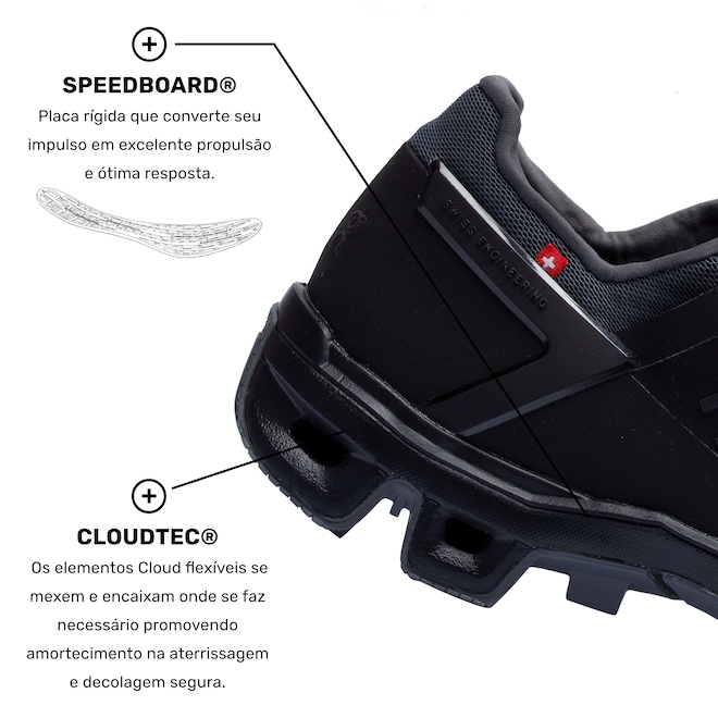 CloudTec®: Os elementos Cloud flexíveis se comprimem vertical e horizontalmente, permitindo o encaixe suave da sua passada. Além de proporcionar um suporte para uma decolagem segura e explosiva, ao retornar os Clouds para a posição original.