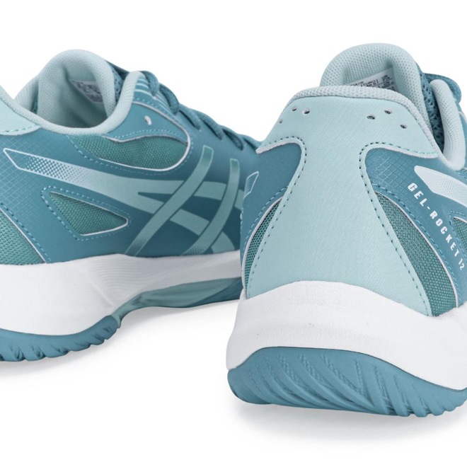- Detalhamento: Fechamento por cadarço, lingueta macia em tecido mesh com o logo da marca no topo e detalhes nas laterais que adicionam um toque especial ao design. O ponto de giro na parte frontal do solado contribui para maior estabilidade nos movimentos laterais. Ideal para quem busca estilo e conforto no dia a dia. A escrita Gel-Rocket 12 aparece próxima ao calcanhar;