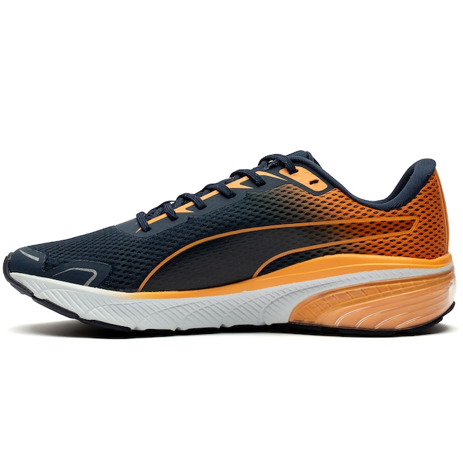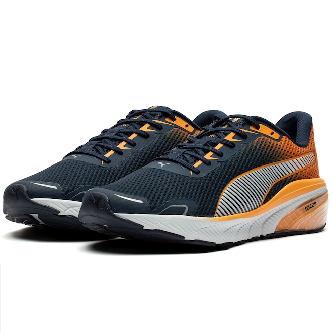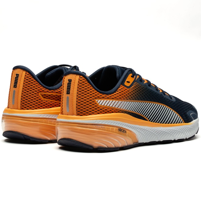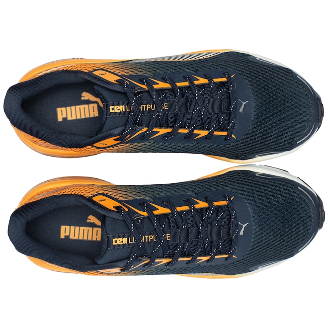 Além disso, o sistema de amortecimento 10CELL, exclusivo da PUMA, oferece estabilidade e suporte superiores, utilizando uma estrutura em forma de grade com células que absorvem o impacto e proporcionam um retorno de energia eficiente.