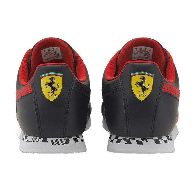 Logos PUMA Roma na lateral e distintivo da marca Ferrari na parte de traseira
