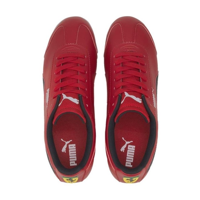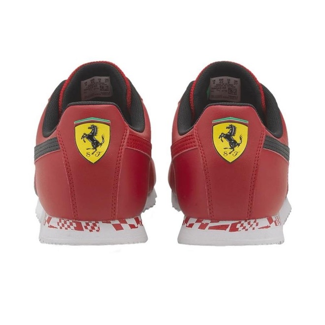 Logos PUMA Roma na lateral e distintivo da marca Ferrari na parte de traseira
