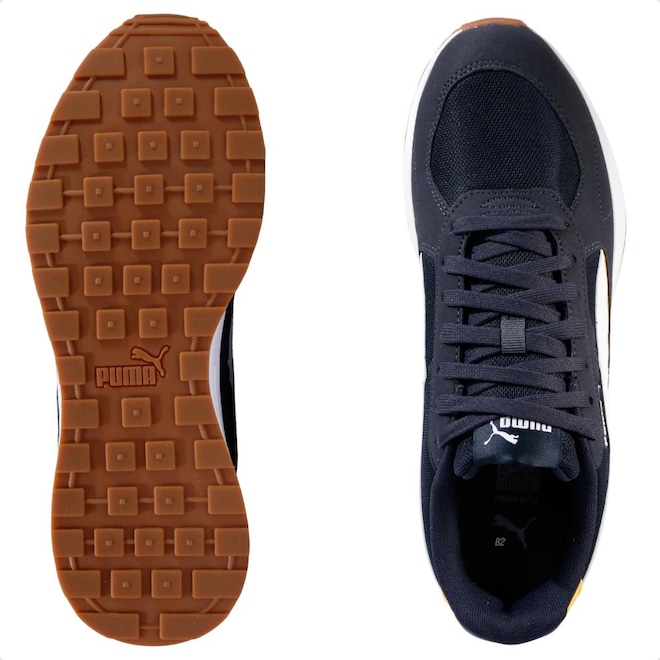 O logo da Puma aparece em destaque nas laterais e na língua. A entressola IMEVA, conhecida por sua leveza, proporciona suporte e maciez