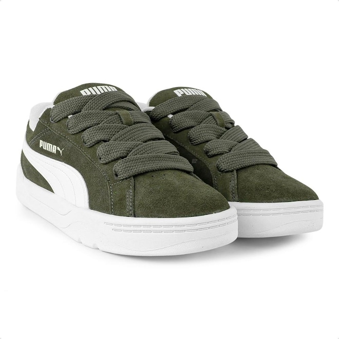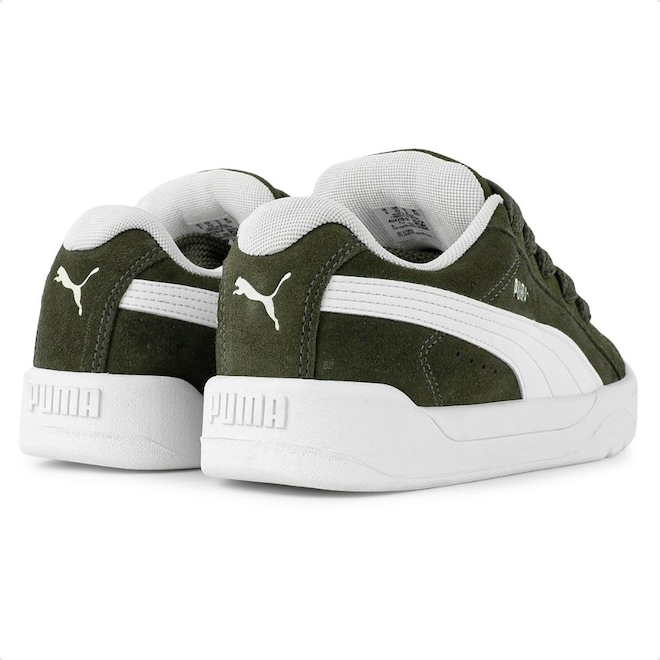 Detalhes como costuras aparentes e o logo da Puma conferem um toque de elegância ao calçado.