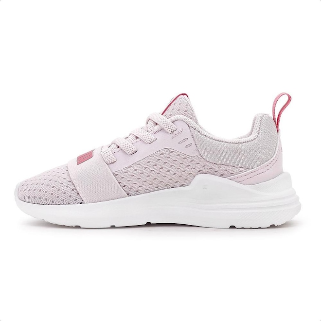 Conta ainda com faixa elástica na parte superior, exibindo a logo PUMA em rosa metalizado.