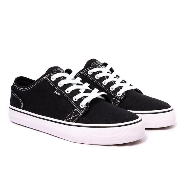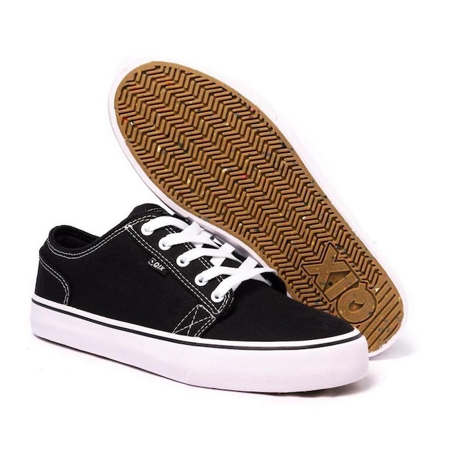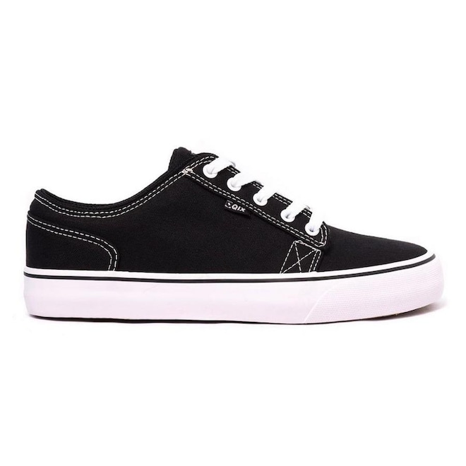 Tênis QIX com cabedal confeccionado em lona, logotipo da marca na língua, lateral do sapato e palmilha.