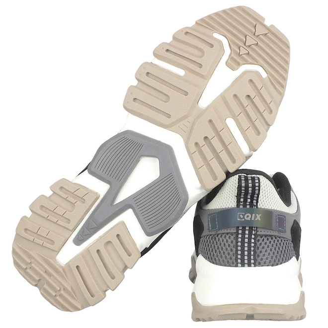 O Tênis Qix Trek Beige Graphite apresenta o logotipo Qix na língua, traseira e palmilha. Possui etiqueta na parte interna da língua. Palmilha anatômica em EVA conformada antibacteriana.  Solado em EVA de alta absorção proporciona um maior conforto ao caminhar, solado com material emborrachado possibilita uma maior aderência ao solo gerando maior segurança ao caminhar. Cabedal produzido em laminado sintético de alta performance, nylon, tecidos e couro natural.