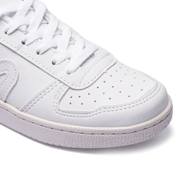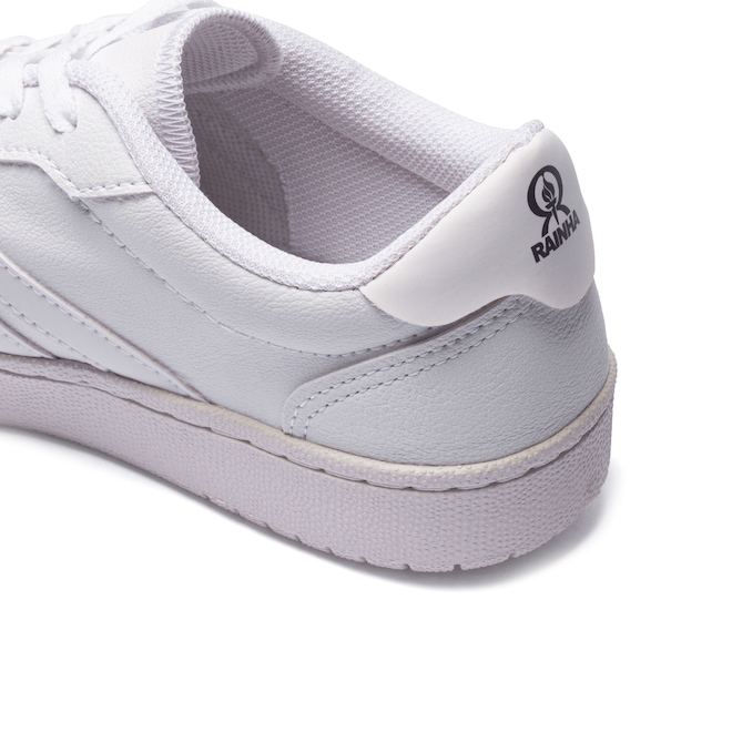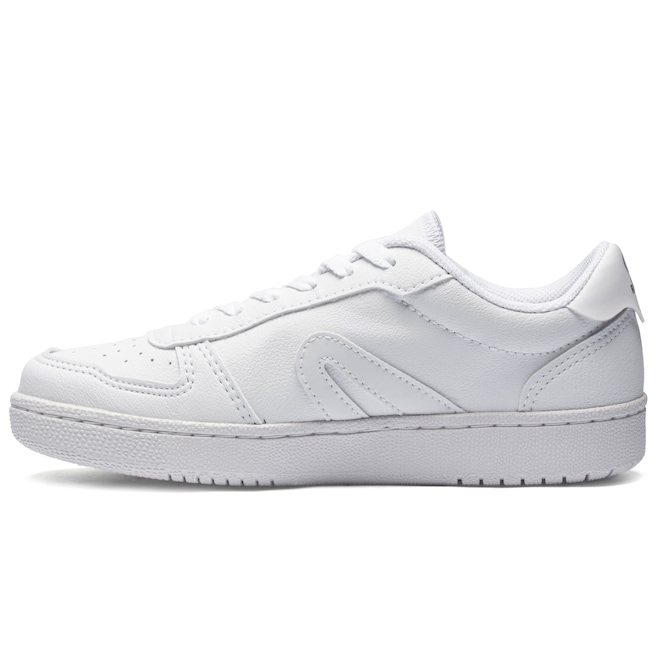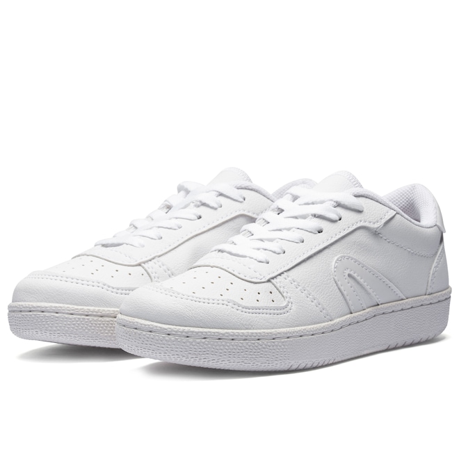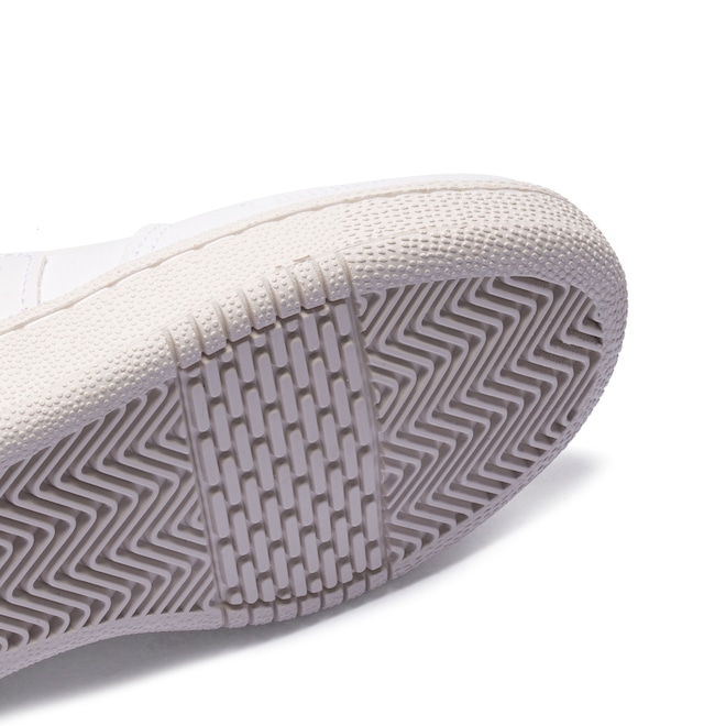 O cabedal (parte superior do tênis) é em material sintético resistente com o icônico logo na laterais.