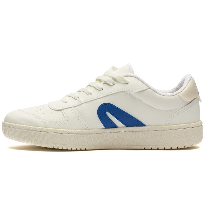O cabedal (parte superior do tênis) é em material sintético resistente com o icônico logo na laterais.