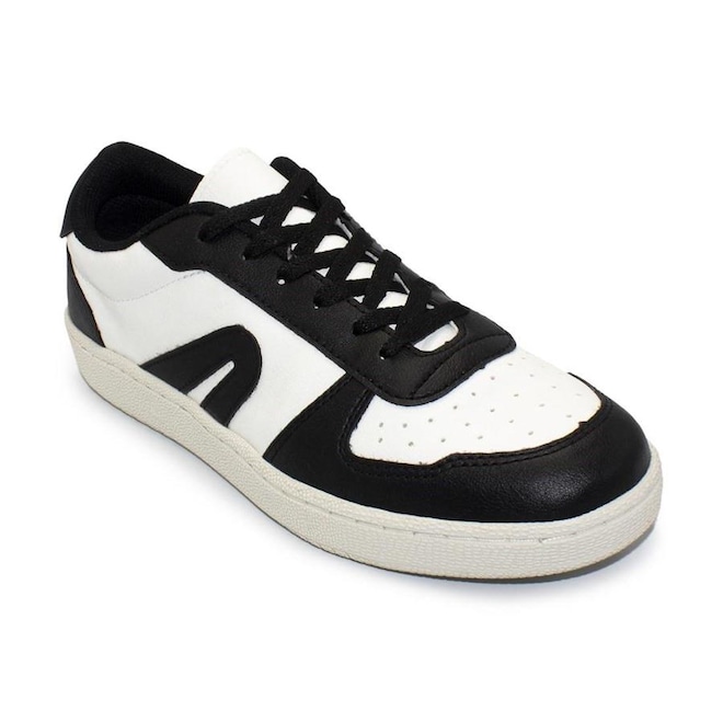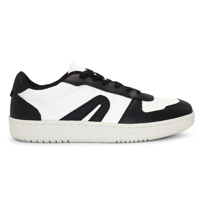 O cabedal (parte superior do tênis) é em material sintético resistente com o icônico logo na laterais.