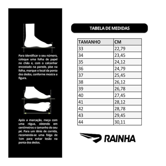 Estampado no CabedalFaixa Etária Adulto Garantia do Fornecedor Contra Defeito de Fabricação Conteúdo da Embalagem 1 Par SAC do Fornecedor RAINHA: São Paulo e Grande São Paulo - (11) 3003-3414 / Demais regiões do Brasil - 0800-707-0566