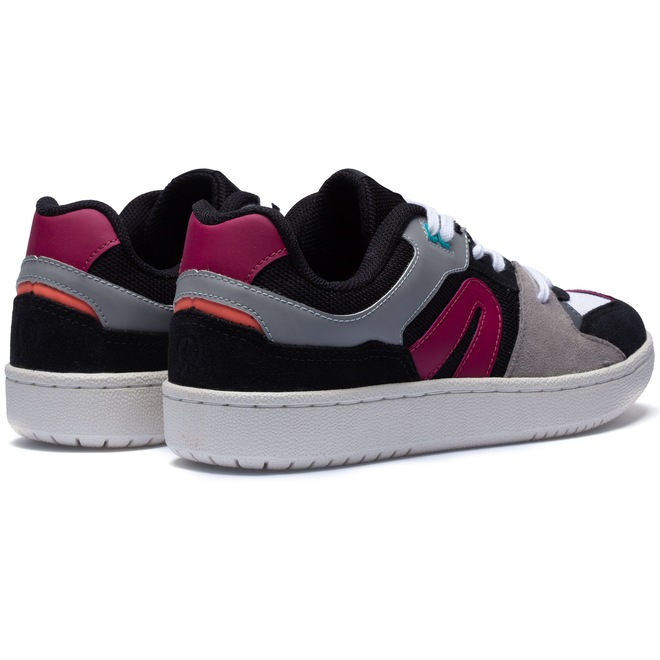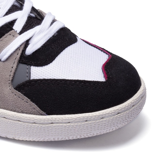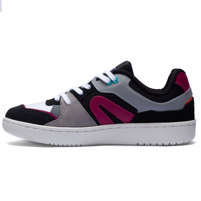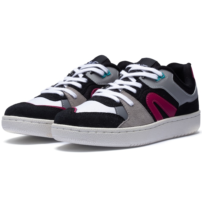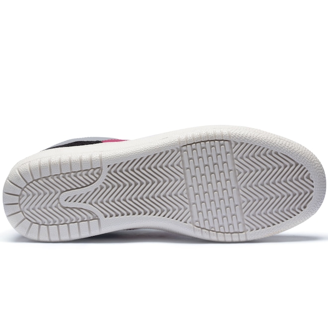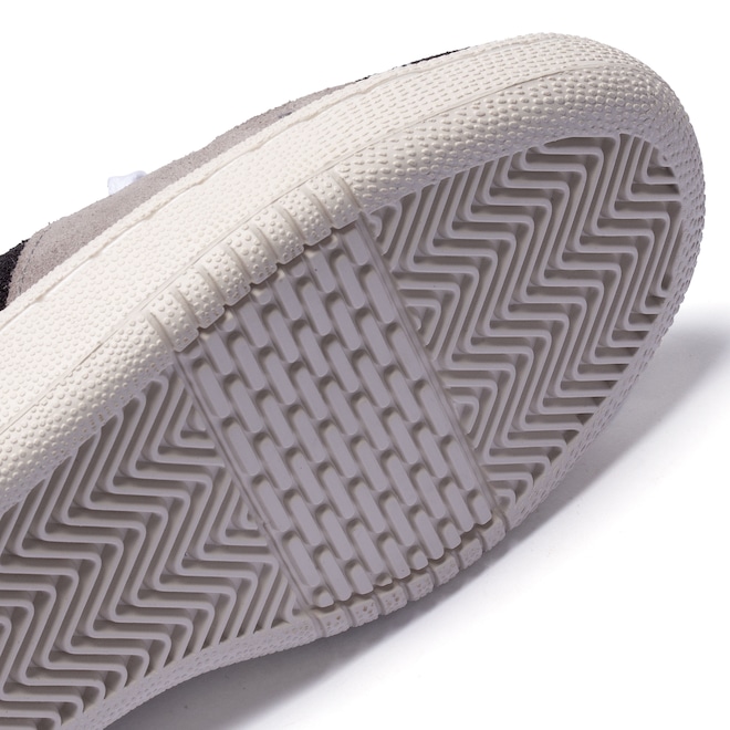 O cabedal (parte superior do calçado) em têxtil, sintético e camurça, com entressola emborrachada estilo “caixa” e solado borracha.