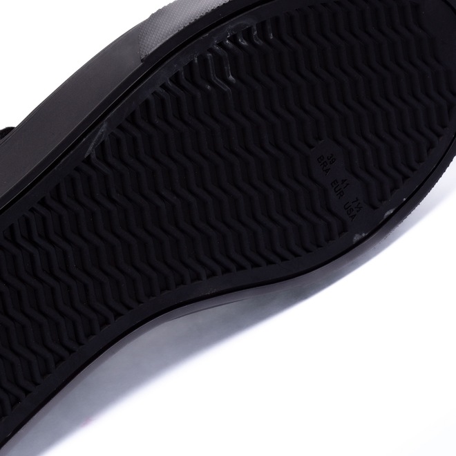O cabedal (parte superior do calçado) tem material têxtil, entressola e solado emborrachado.