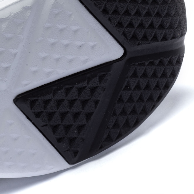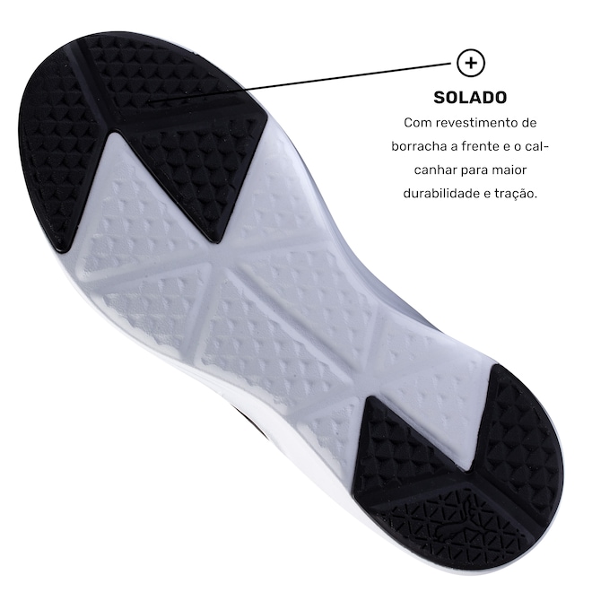 O solado apresenta detalhes emborrachados em locais estratégicos para aderência e durabilidade em zonas de alto impacto.