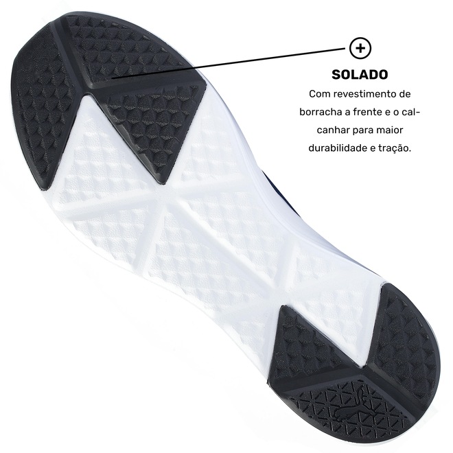 O solado apresenta detalhes emborrachados em locais estratégicos para aderência e durabilidade em zonas de alto impacto.