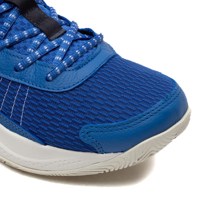 O solado de borracha aderente proporciona excelente tração em quadras, permitindo cortes rápidos e mudanças de direção sem deslizar.