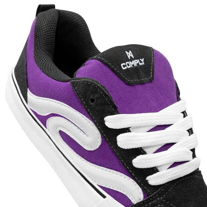 - Combinação de looks: Combine o Tênis Comply Preto Roxo com jeans, joggers ou shorts para criar um visual streetwear moderno.