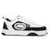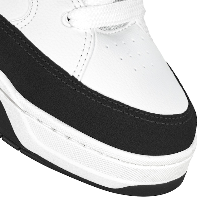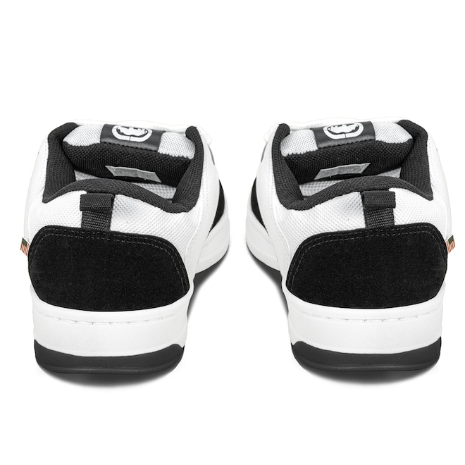 - Cabedal em Couro Sintético Premium: Estrutura resistente com recortes em branco e preto que valorizam o contraste visual.