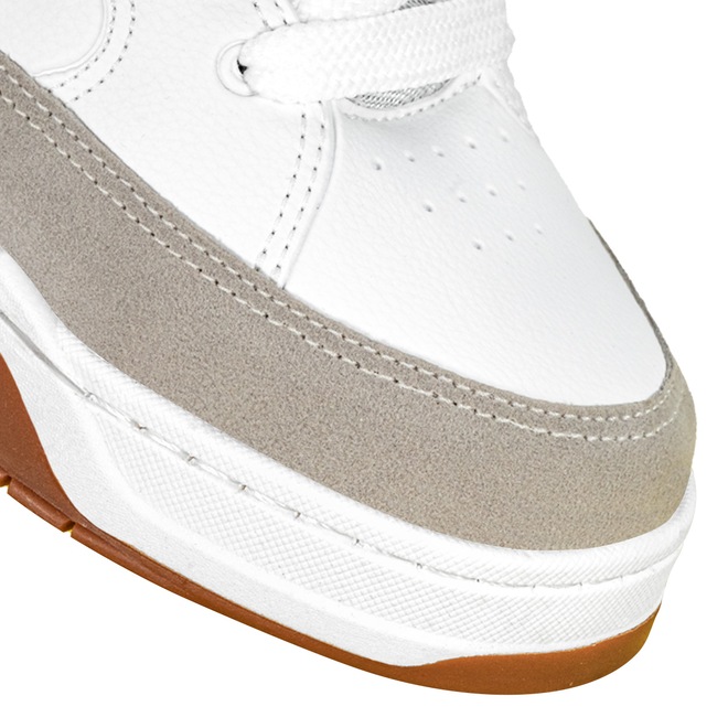 - Cabedal em Couro Sintético: Estrutura durável com recortes em branco e detalhes em vermelho intenso.
