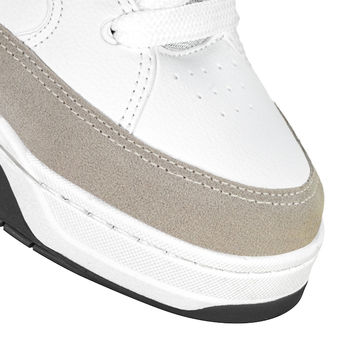 - Cabedal em Couro Sintético: Material resistente com acabamento em branco, cinza e detalhes em preto.