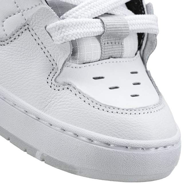 - Cabedal premium: camurça e sintético em acabamento all white, resistente e estiloso.
