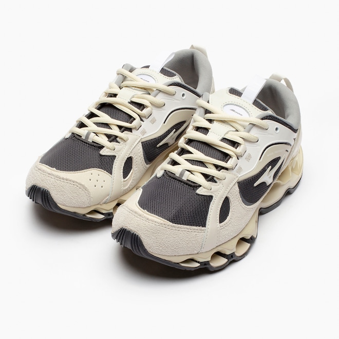 Mizuno Wave®: Nova geração da tecnologia Wave, que garante a efetividade inicial de amortecimento do tênis durante 500 km de uso, garantindo 100% da performance do sistema e proporcionando maior dissipação de impactos.