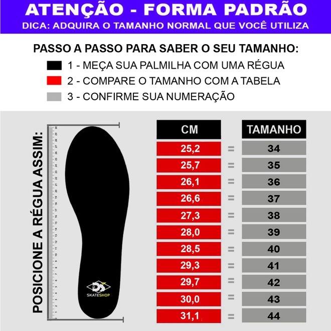 ATENÇÃO: Verifique as medidas da sua palmilha e compare com a deste modelo antes da compra, evitando transtornos em caso de troca.