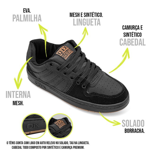 O Tênis Qix 80s Preto Preto é a escolha ideal para quem busca um calçado versátil, resistente e com forte identidade street. Inspirado na estética clássica dos anos 80, este modelo entrega um visual totalmente preto, clean e atemporal, perfeito para compor looks urbanos e casuais.