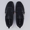O cabedal combina malha estruturada no calcanhar para firmeza com tela resistente no antepé, garantindo respirabilidade e durabilidade.