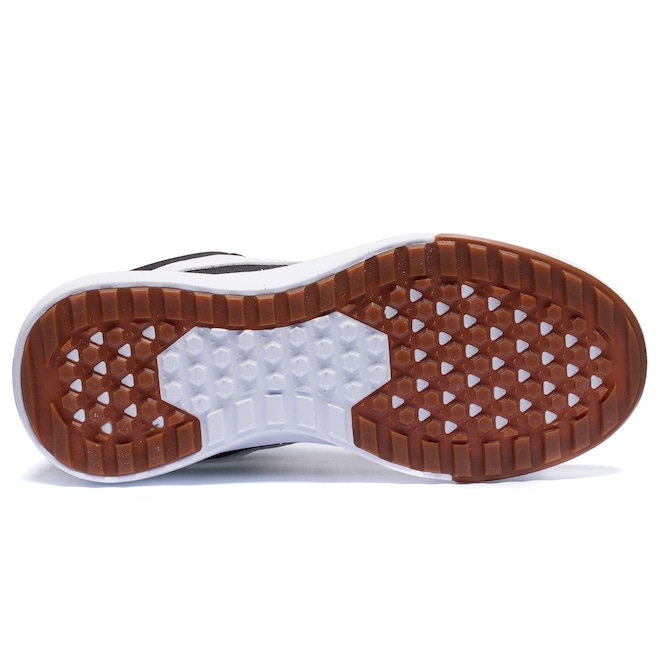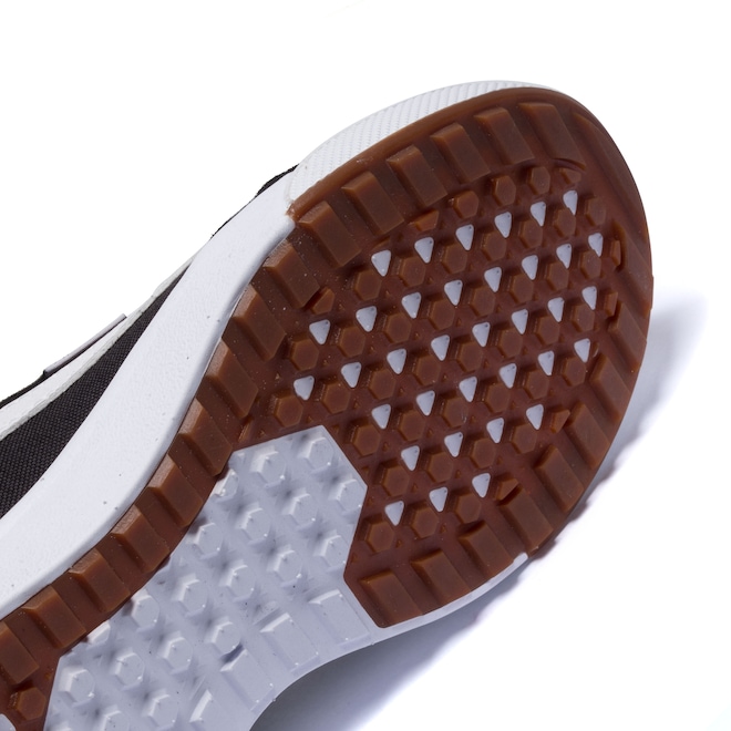 O tênis apresenta entressola em EVA e solado emborrachado que garantem maior estabilidade e aderência em superfícies irregulares.