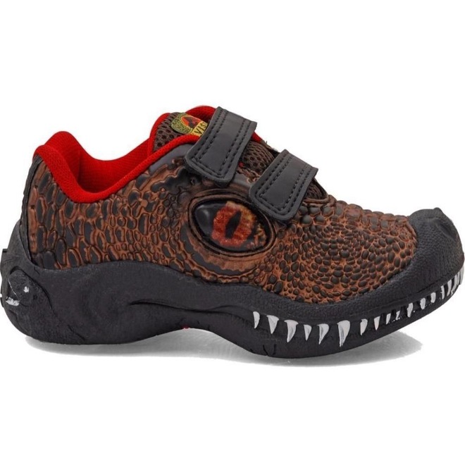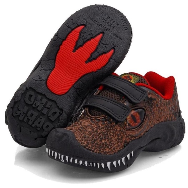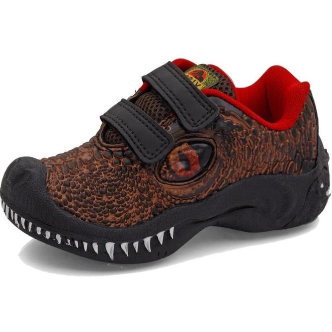 Tênis Vissi Dinossauro Infantil e , com cabedal que remete a cabeça de dinossauro, detalhes metalizados e fechamento por velcro.Forro em material têxtil e pamilha em EVA, ambos macios.