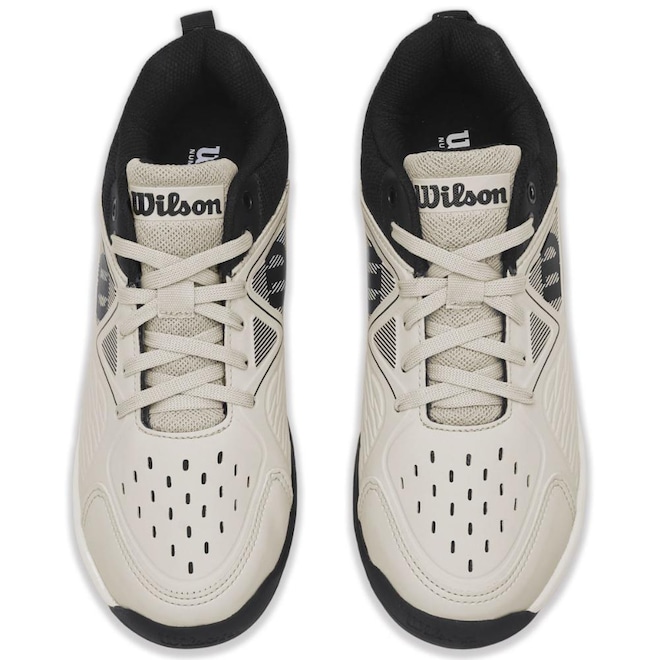 - Detalhamento: Fechamento convencional em cadarço, lingueta macia em mesh com escrita Wilson no topo, palmilha removível, logo Wilson nas laterais próximo ao calcanhar, biqueira reforçada;