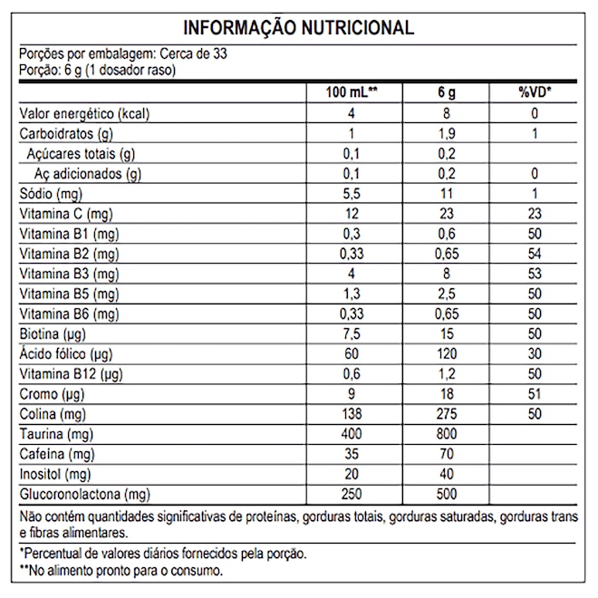 Ingredientes Sabor : Tangerina Mix de vitaminas e minerais (bitartarato de colina, ácido ascórbico (vitamina C), nicotinamida (vitamina B3), pantotenato de cálcio (vitamina B5), riboflavina (vitamina B2), piridoxina (vitamina B6), tiamina mononitrato (vitamina B1), ácido fólico, picolinato de cromo (cromo), biotina (vitamina H), cianocobalamina (vitamina B12)), taurina (800mg/200mL), glucoronolactona (500mg/200mL), chá verde, maltodextrina, cafeína anidra (70mg/200mL), gengibre, inositol (40mg/200mL), pimenta vermelha, acidulantes ácido cítrico e ácido ascórbico, aromatizantes, antiumectante dióxido de silício, regulador de acidez citrato de sódio, edulcorante sucralose e corante artificial amarelo crepúsculo. NÃO CONTÉM GLÚTEN.