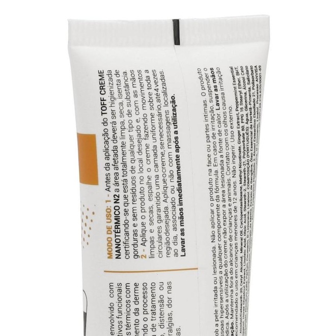 O Toff Care Creme Nanotermico N2 Aquecimento Moderado foi desenvolvido para aliviar as dores musculares Conheça as características do Toff Care Creme Nanotermico N2 Aquecimento Moderado - Perfil: Tennis e outros esportes - Composição: Água, Glicerina, Álcool cetoestearílico, Álcool cetílico, Álcool, Óleo mineral, Ciclopentasiloxano, Nicotinato de Metila, Extrato de gengibre, Óleo essencial de hortelâ-pimenta, Salicilato de Metila, Aminometil Propanol, Extrato de Castanha da Índia, Ácido Linoleico, Ácido Oleico, Álcool Estearílico Etoxilado 2, Álcool Estearílico Etoxilado 21, Polisorbato 80, Éter Estearílico, PPG-15, BHT, DMDM Hidantolina, Iodo Propinil, Butilcarbamato, EDTA Dissódico, Perfume, Coumarina, D-Limoneno, Linalol.