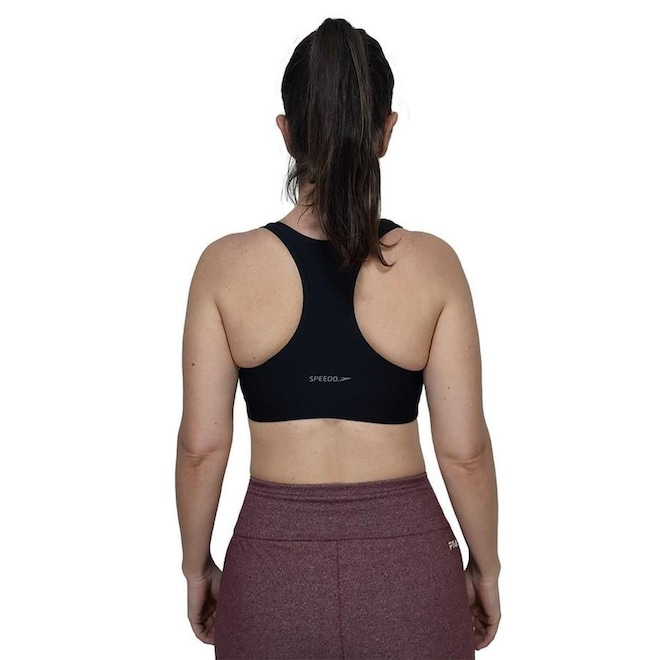 Possui bojo removível e cós com elástico, além de decote nadador profundo nas costas.