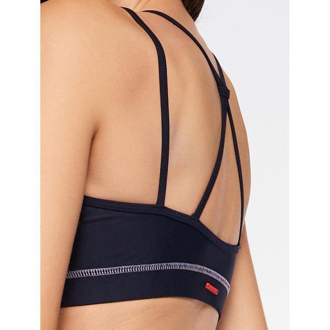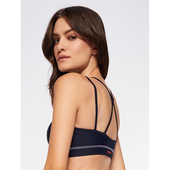 Top liso com alças finas cruzadas nas costas, trançadeiras em cor contrastante e bojo removível. Sustentação leve. Referência: 04276 Coleção: Light Tamanhos: P, M, G e GG. Tecido: Body Peach + Luna Composição: BODY PEACH 78% Poliamida 22% Elastano Te