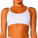 • Alças de Elástico Logotipado (Branding): As alças são confeccionadas em elástico de alta densidade, personalizado com a escrita da marca. Essa característica não apenas confere um forte elemento de branding e diferencial estético, mas também garante a estabilidade do top durante exercícios de média e alta intensidade.