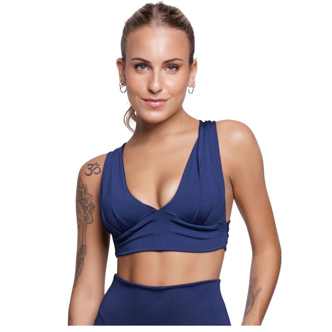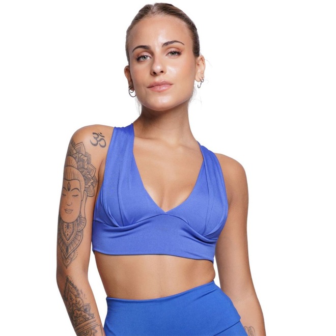 Confeccionado em suplex, esse modelo possui bojo, decote em V e detalhe cruzado nas costas. Confortável, ele promove melhor sustentação e segurança para a prática de atividades físicas e uso diário.