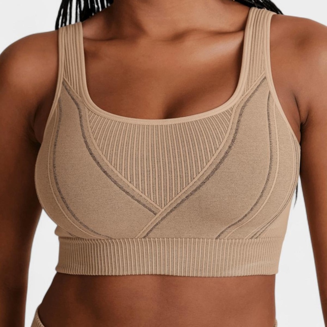 Confeccionado com tecido Seamless Dry: Sem costura: Desenvolvido com a mais moderna tecnologia sem costura, possui grande diversidade de pontos e detalhes, possui menos áreas de atrito, sendo que toda estrutura da peça é uniforme, resultando em uma vestibilidade de maior conforto com a tecnologia que permite o uso de pontos para sustentação e suporte muscular. Contém tecido antimicrobial, com tratamento de higienização que impede a proliferação de microrganismos e bactérias causadores de odores e alças médias, possui decote frontal e posterior em formato quadrado, além de ter um charmoso detalhe de desenhos de listras e texturas.