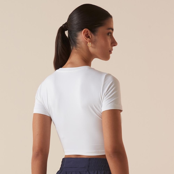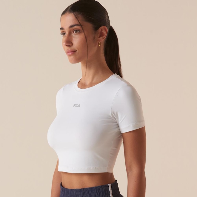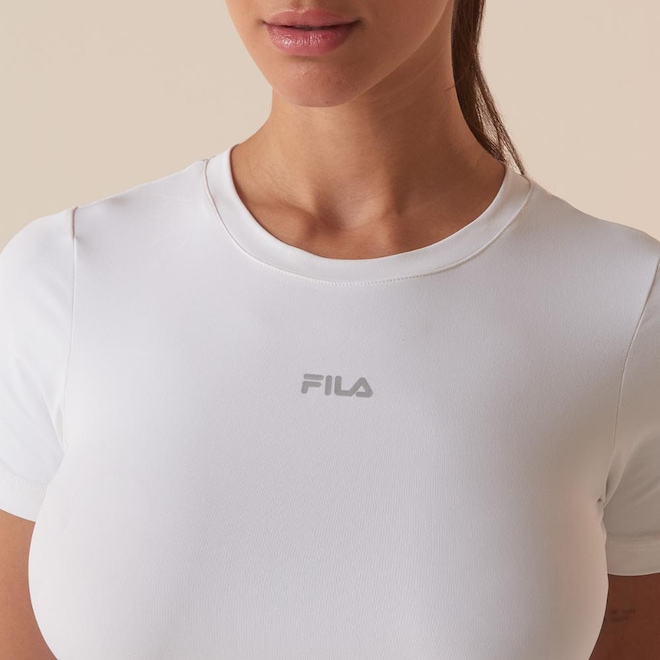 Top feminino confeccionado em malha de poliamida com poliéster. Modelagem slim fit, ajustada ao corpo, com comprimento cropped e manga curta. Seu tecido contém as tecnologias FLOW, que oferece secagem rápida e mantém o corpo na temperatura ideal para a prática esportiva, e a UV PROTECTION, que fornece proteção solar FPS 50+ dos raios UVA e UVB. Possui gola careca pespontada e logo Fila Letter centralizado na parte frontal superior.
