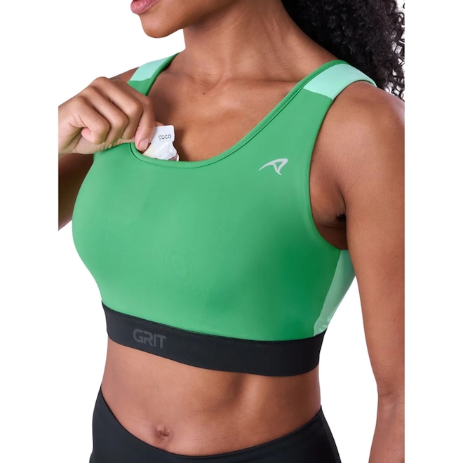 O top esportivo de suporte máximo GRIT Bossa Ajustável 1 Bolso Reto é um vestuário técnico concebido para longas jornadas de corrida e competições. É recomendado para quem deseja um top antiflacidez e prefere que o apoio seja distribuído sobre os ombros.