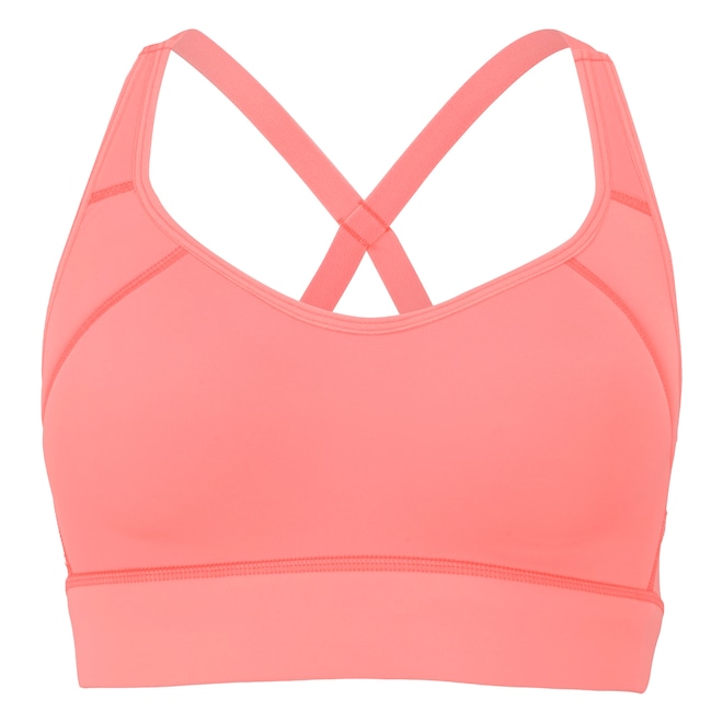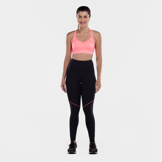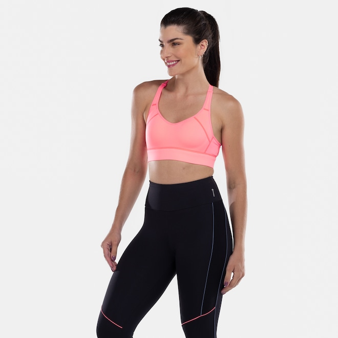 Tem bojo fixo, alta sustentação e suas alças são cruzadas com decote traseiro.
