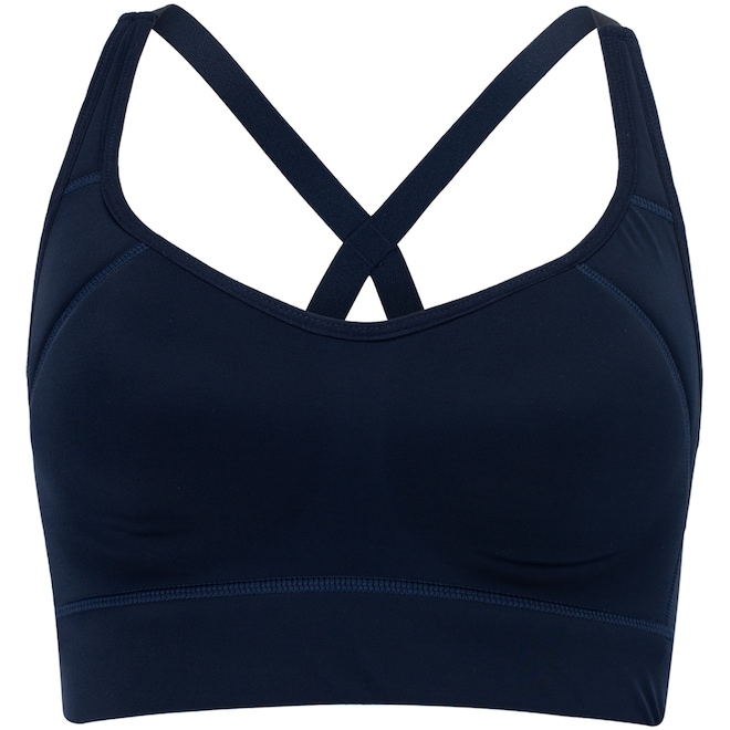 Tem bojo fixo, alta sustentação e suas alças são cruzadas com decote traseiro.