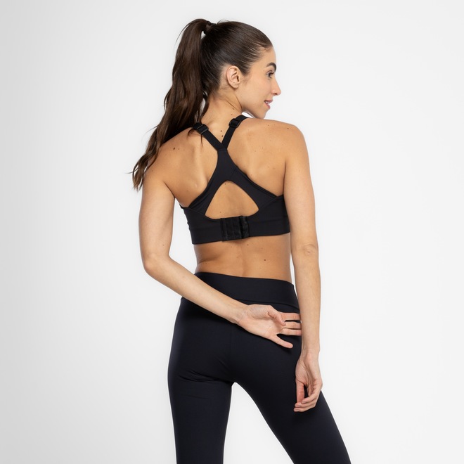 As alças são largas, reguláveis e integradas ao decote traseiro estilo “nadador” que garante total liberdade dos movimentos.