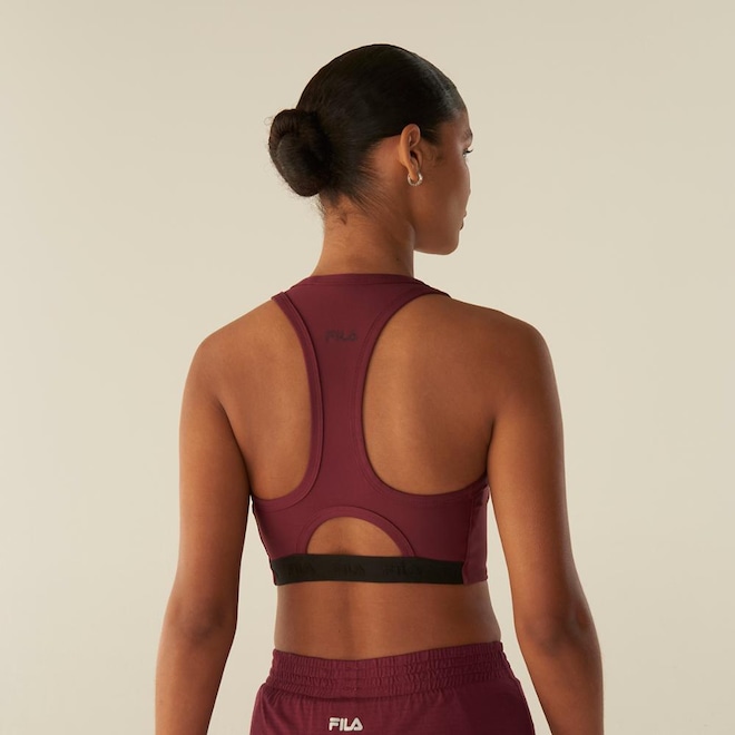 Top feminino confeccionado em malha de poliéster com elastano, oferecendo elasticidade e suporte ideais. Possui modelagem em costas nadador, comprimento alongado e elástico personalizado na barra traseira, garantindo firmeza e ajuste seguro. O design apresenta ombros deslocados para a frente, favorecendo a mobilidade, e forro interno para maior conforto.