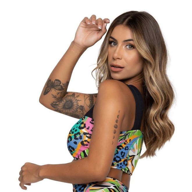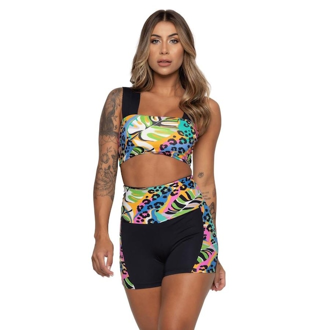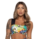 Top fabricado em suplex poliamida, com mix de tecido liso estampado.