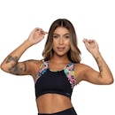 Top fitness produzido em suplex poliamida com mix de tecido liso e estampado.