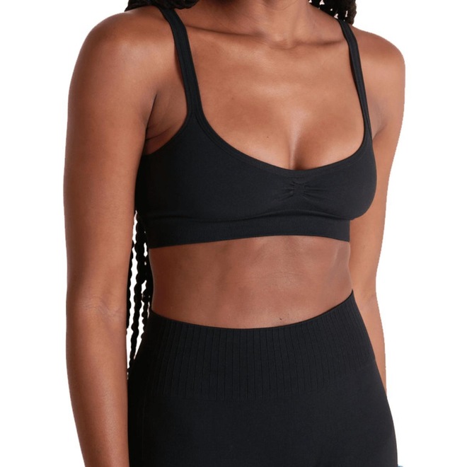 Top sem costura com modelagem alongada, base em poliamida brilhante, trazendo uma leve cintilância e textura lisa ao produto.