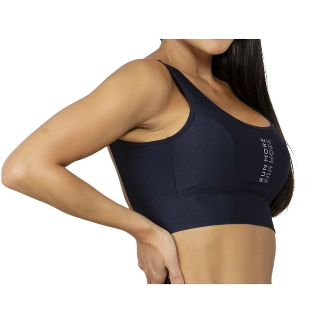 Este top esportivo apresenta uma estilosa aplicação frontal em gel com o emblema espelhado da Run More.