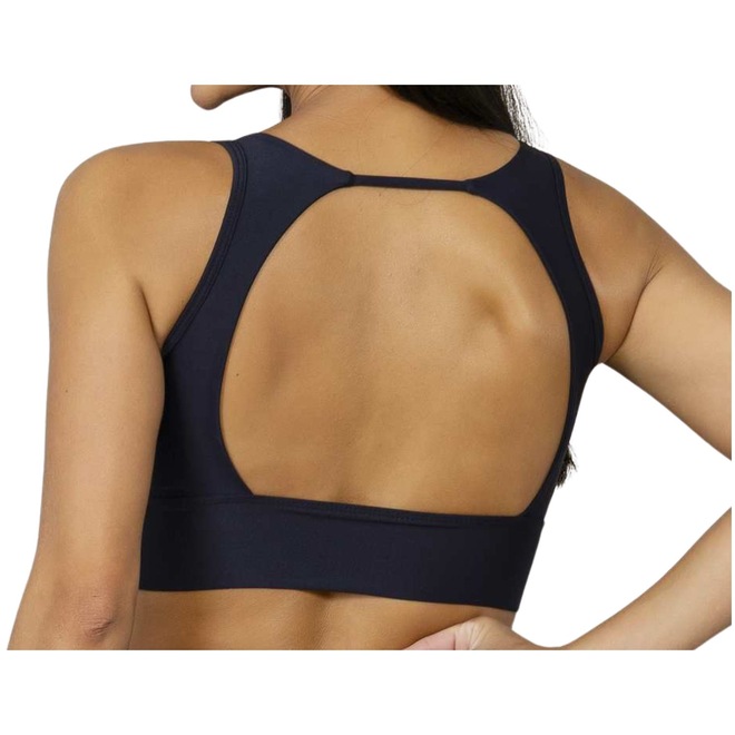 O design incorpora recortes na frente que moldam e valorizam o busto, além de contar com alças largas e bojo que pode ser removido.